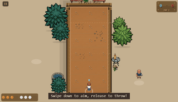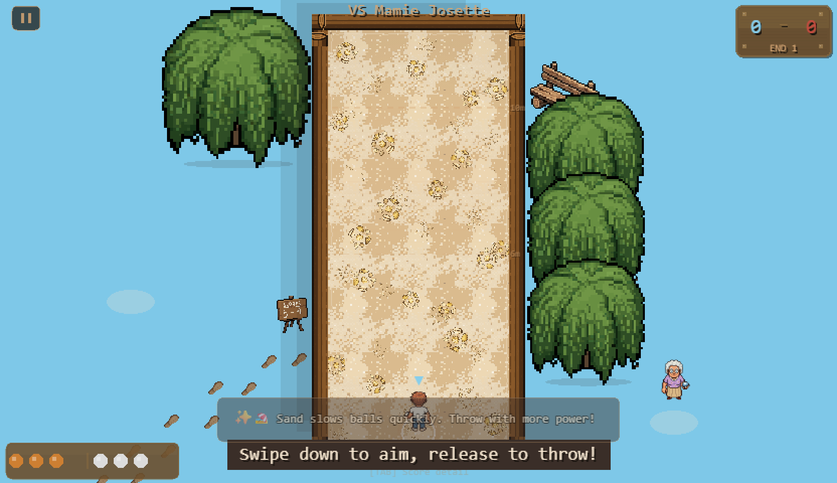Five terrains, five different games. Village dirt is forgiving. The park mixes grass and gravel — watch the zones. Sand is where your ball goes to die. The hill makes you constantly misjudge your power. The docks have hard tiles that bounce off walls.