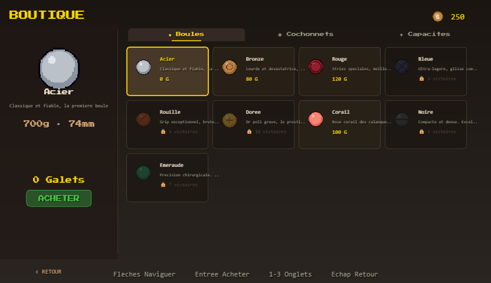 Trois façons de lancer (demi-portée, plombée, tir au fer), cinq terrains avec une physique vraiment différente, une boutique pour améliorer tes boules et ton cochonnet, et un mode Arcade avec progression.